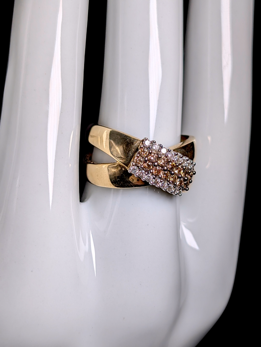 Vintage Designer Heng Ngai 10kt Solid Yellow Gold Genuine White and Chocolate Diamond Cross Over Band Ring