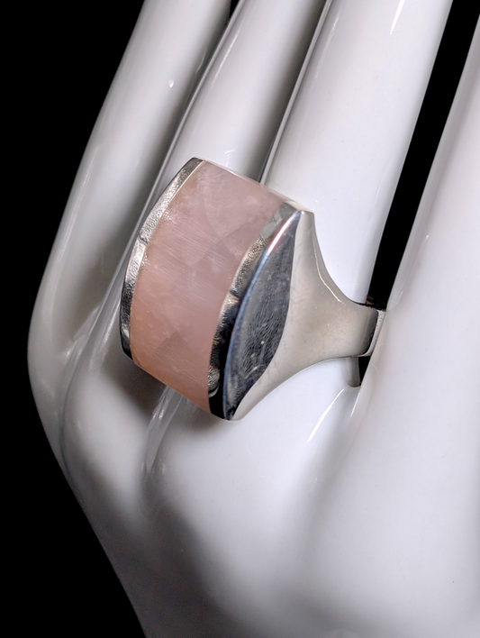 Vintage Italian Designer Modernist Bezel Set Verified Rose Quartz Solitaire Sterling Silver Statement Ring