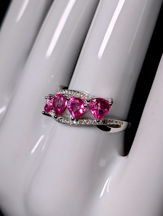 Vintage Inspired Four Tear Drop Cut Verified Pink Topaz and Simulated Diamond Accents Sterling Silver Row Band Ring