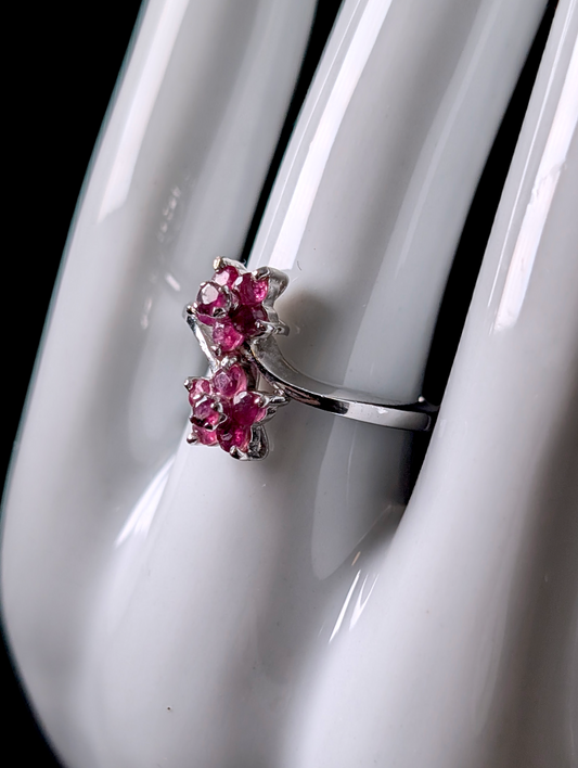 Vintage Dainty Twin Flower Round Cut Earth Mined Genuine Ruby Sterling Silver Ring