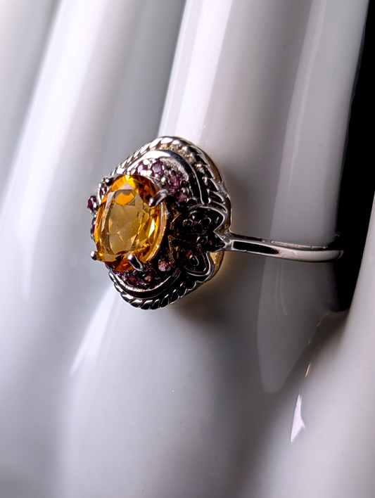 Vintage Oval Cut Genuine Citrine Solitaire and Amethyst Halo Sterling Silver Ring