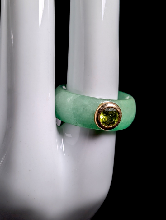 Vintage 14K Yellow Gold Bezel Set Round Cut Genuine Peridot Solitaire and Jade Band Ring