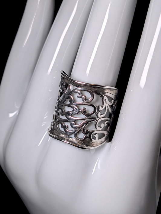 Vintage Israel Designer Shield Cuff Filigree Cut Out Sterling Silver Statement Ring