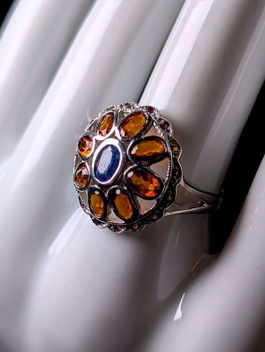 Vintage Round Cluster Genuine Kyanite, Citrine and Tourmaline Sterling Silver Ring