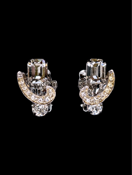 1950s Weiss Crystal Rhinestone Earrings with Gold Ribbon Accents