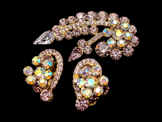 1950s Pink Morganite Crystal Rhinestone Aurora Borialis Shooting Star Pin and Matching Cluster Earrings Set