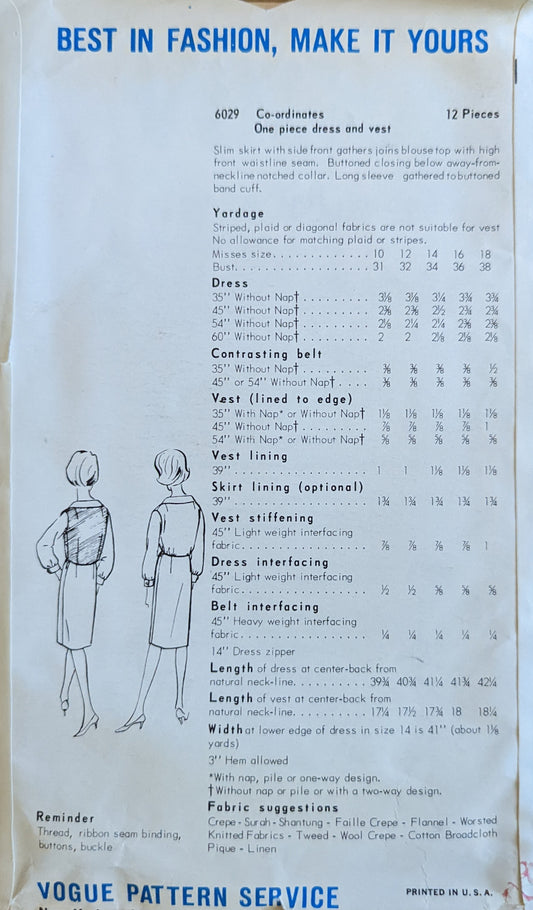 1960s Vogue 6029 Sewing Pattern in Size 14