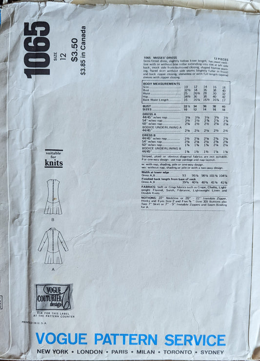 1970s Fabiani Vogue Couturier Design 1065 Sewing Pattern in Size 12