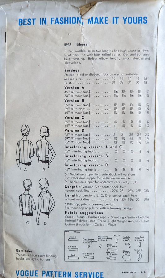 1963 Vogue 5938 Sewing Pattern in Size 14