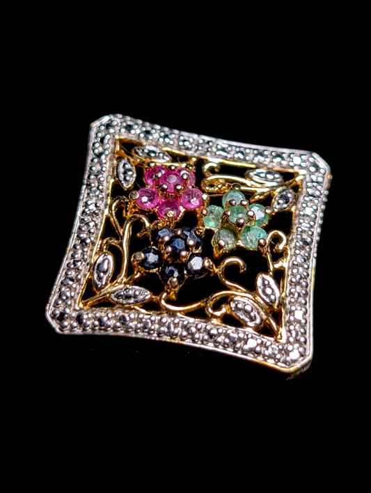 Vintage Flower 3 Stone Genuine Ruby, Sapphire and Emerald with Diamond Accents Yellow Gold over Sterling Pendant