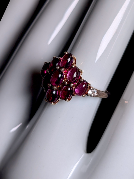 Vintage Cabochon Cluster Genuine Raspberry Garnet with White Topaz Accents Sterling Silver Ring