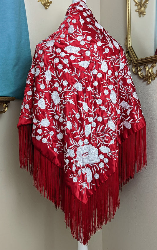 Vintage Silk Charmeuse Piano Shawl in Red With White Floral Silk Hand Embroidery, Finished with a Hand Knotted Fringe
