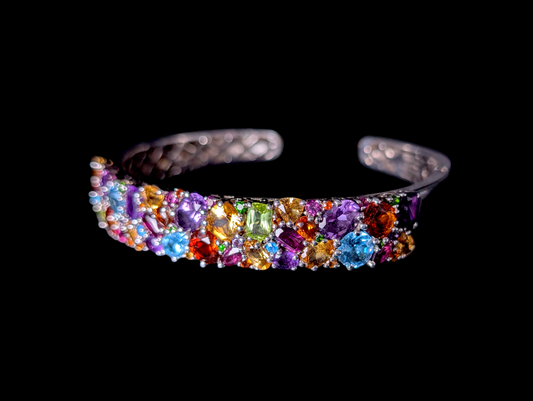 Vintage Mixed Cut Genuine Multi Gemstone Rhodium Plated Sterling Silver Hinged Cuff Bracelet