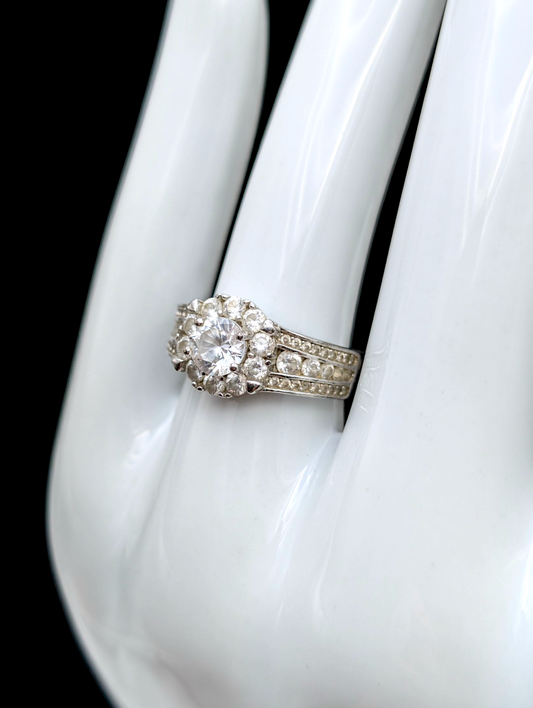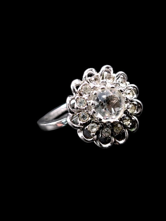 Vintage Edwardian Inspired Flower Cluster Simulated Diamond Sterling Silver Vacation Ring