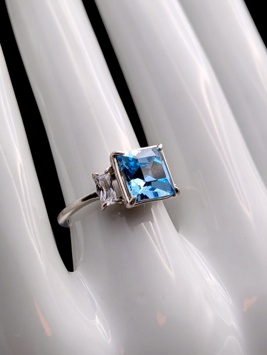 Vintage Princess Cut Simulated Swiss Blue Topaz and Simulated Diamond Silver Tone Dainty Ring