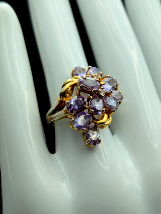 Vintage Flower Cluster Simulated Amethyst and Simulated Diamond Accented Gold Tone Statement Ring