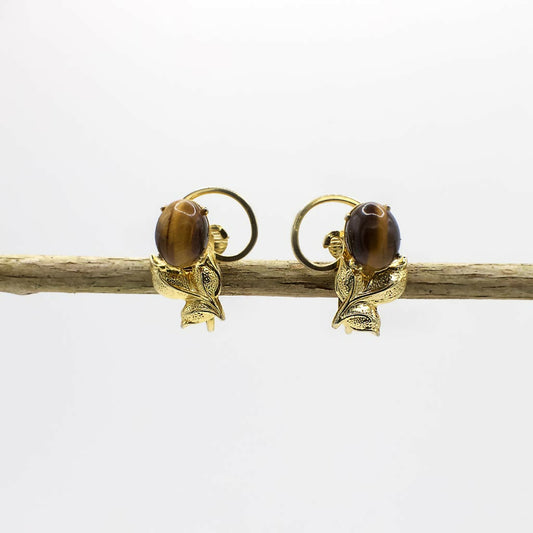 Vintage 12K Gold Filled Genuine Tigers Eye Cabochon Clip On Earrings