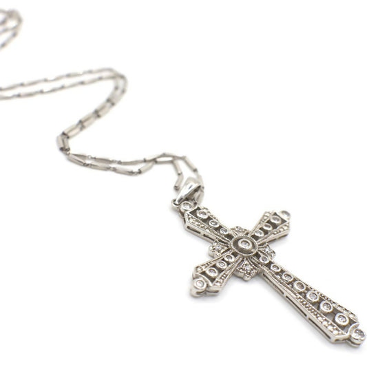 Vintage Sterling Silver Filigree and Simulated Diamond Cross Pendant Necklace