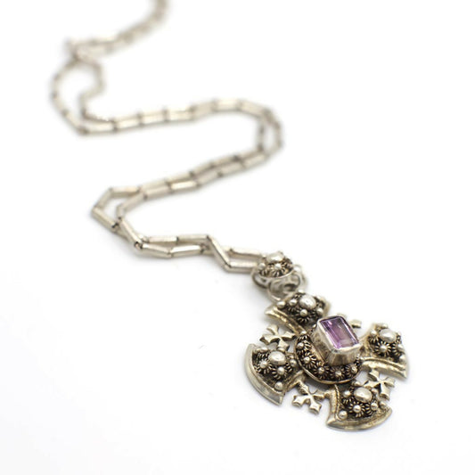 Vintage Genuine Amethyst Crusader Cross Pendant Necklace In Silver