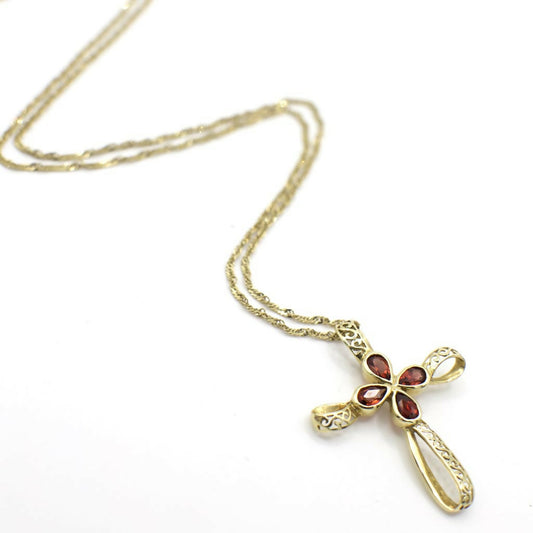 Vintage Genuine Garnet and 10K Yellow Gold Filigree Cross Pendant Necklace