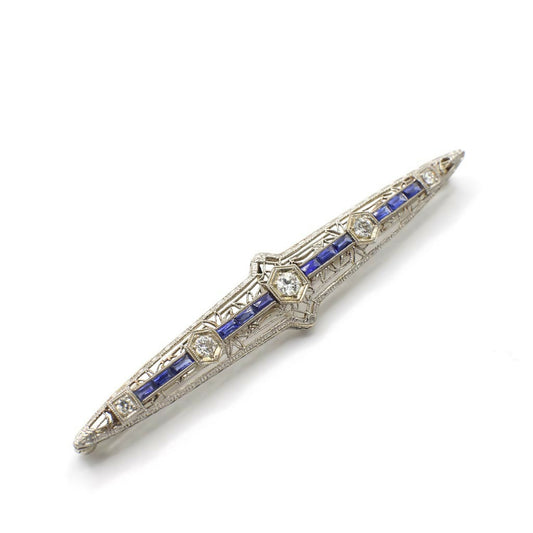 Circa 1920-1930s Edwardian Style Genuine Diamond and Sapphire Filigree Bar Pin in 14K White Gold