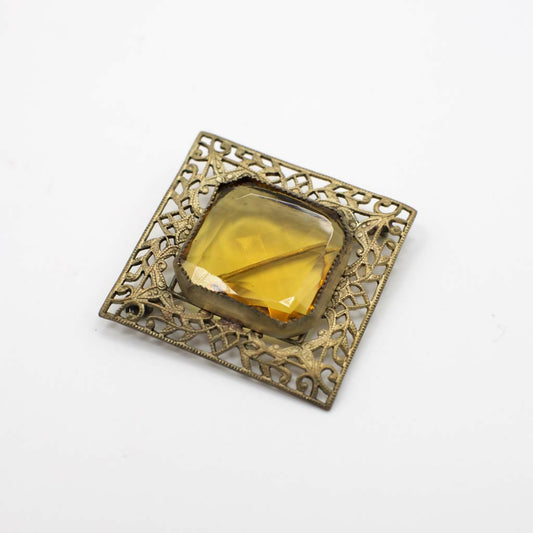 Antique Victorian Simulated Citrine Gold Tone Filigree Brooch