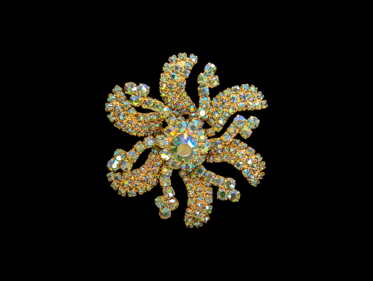 1950s - 1960s Large Iridescent Layered Seafoam Blue Green Aurora Borealis Rhinestone Crystal Flower Brooch Pin