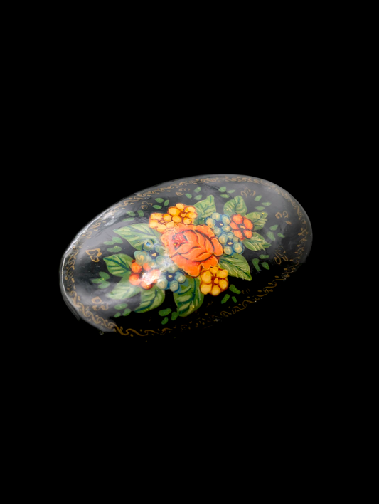 Antique Hand Painted Russian Lacquer Florals on Wood Oval Brooch Pin