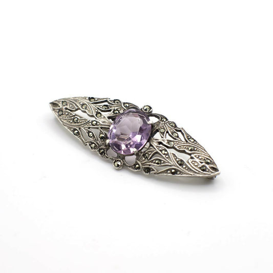 Antique Arts and Crafts Era Genuine Earth Mined Amethyst and Marcasite Brooch Pin In Sterling Silver