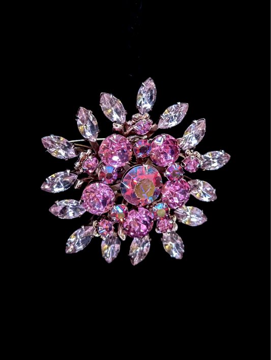 Mid-Century Modern Pink Aurura Borealis Crystal Rhinestone Brooch and Earrings Set