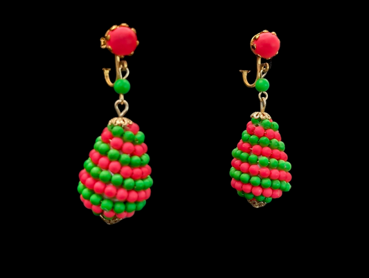 1960s - 1970s Mod Neon Pink and Electric Green Beaded Tear Drop Dangle Earrings