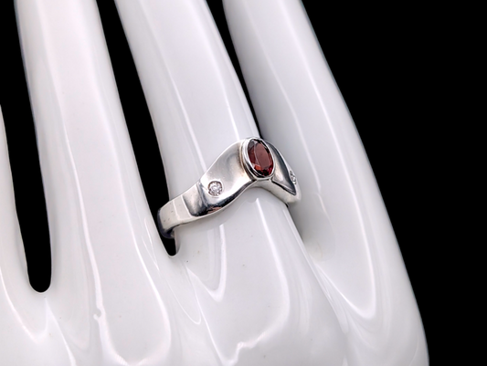 Vintage Unique Solitaire Red Garnet and Simulated Diamond Curved Wave Sterling Silver 925 Ring