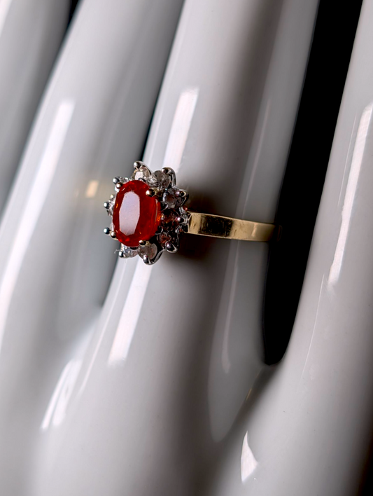 Vintage 14K Gold Genuine Cherry Fire Opal Solitaire and White Topaz Halo Ring
