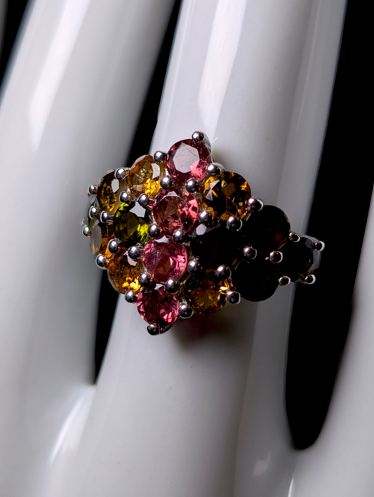 Vintage 3+ Carat Cluster Round Cut Genuine Multicolor Tourmaline Sterling Silver Ring