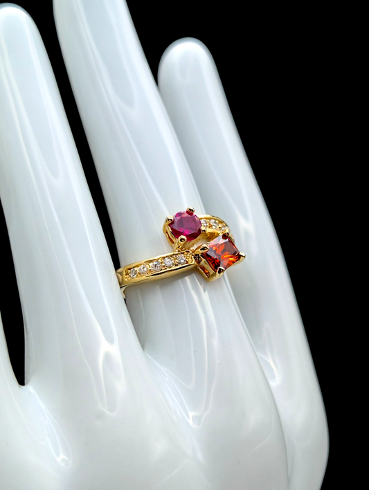 Vintage Bypass Round and Radiant Cut Genuine Ruby and Orange Spessartite Garnet with Simulated Diamond Accented Gold Toned Ring