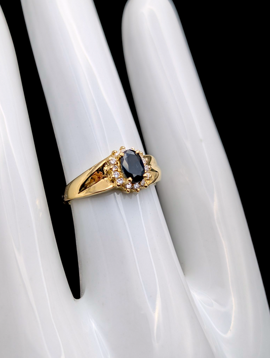 Vintage Oval Solitaire Genuine London Blue Topaz and Simulated Diamond Halo Gold Toned Ring