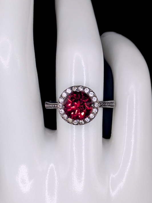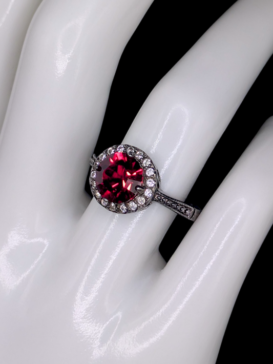 Vintage Oval Cut Genuine Ruby Solitaire with Simulated Diamond Halo Sterling Silver Statement Ring