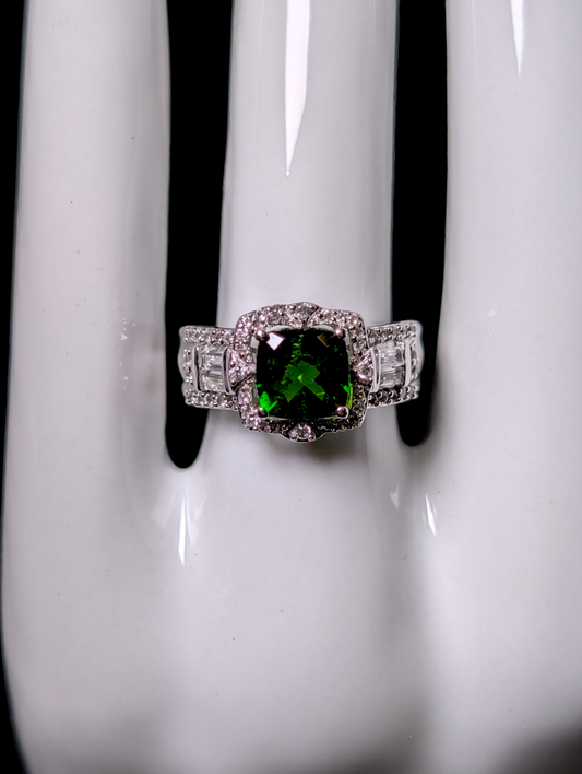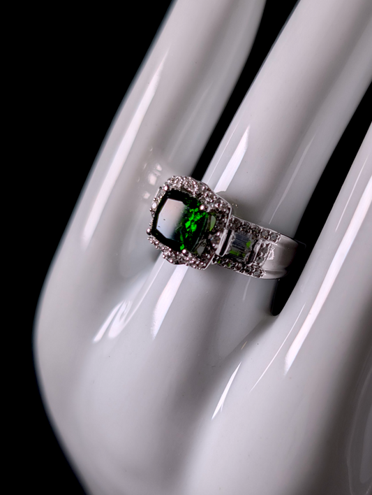 Vintage Dazzling Diamond Cluster Genuine Emerald with Peridot Halo Sterling Silver Statement Ring