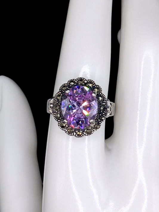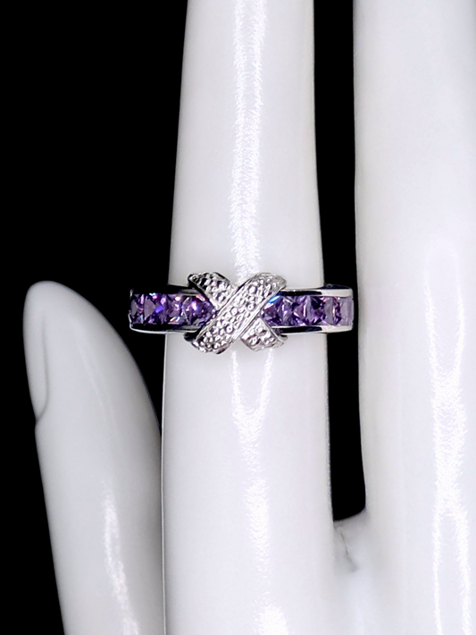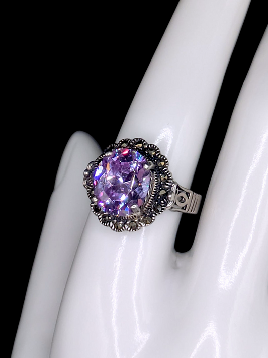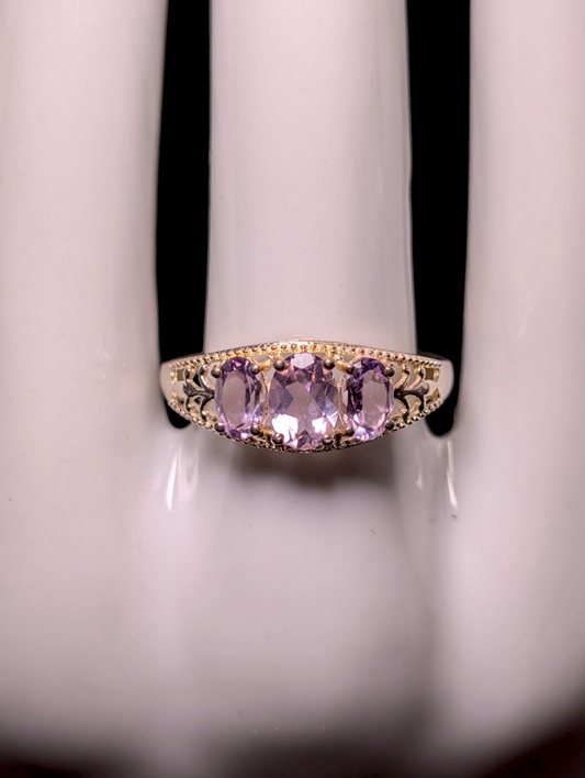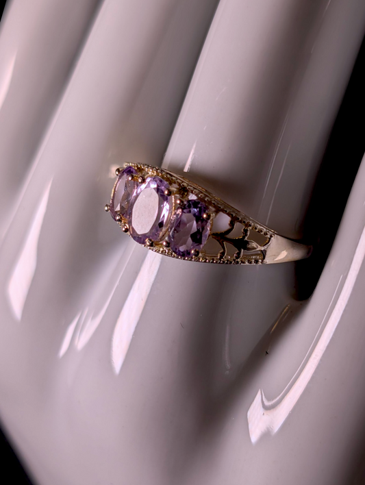 Vintage Diamond Cut 3 Stone Genuine Lavender Amethyst Sterling Silver Ring