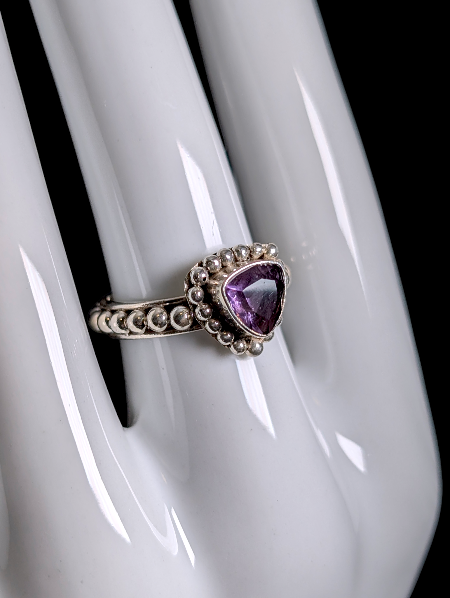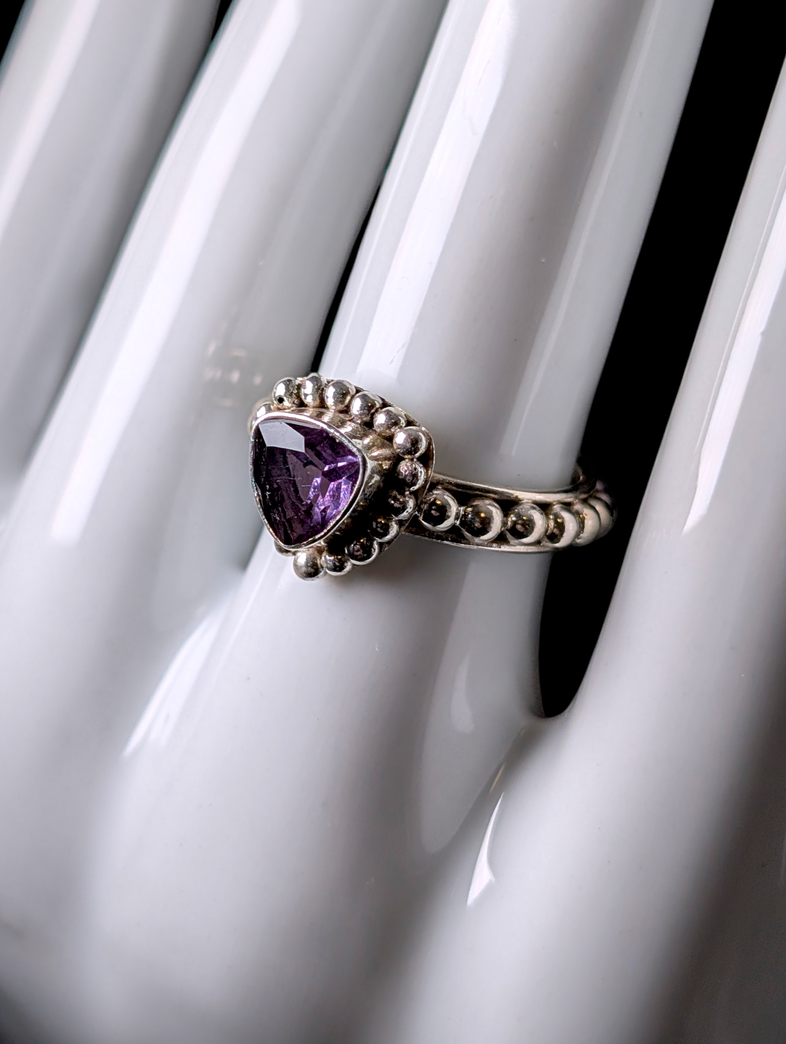 Vintage Artesian Bezel Set Trillion Cut Genuine Amethyst Solitaire Studded Band Sterling Silver Ring