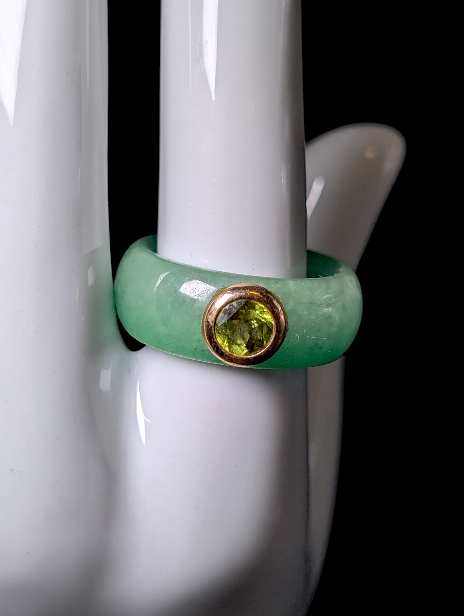 Vintage 14K Yellow Gold Bezel Set Round Cut Genuine Peridot Solitaire and Jade Band Ring