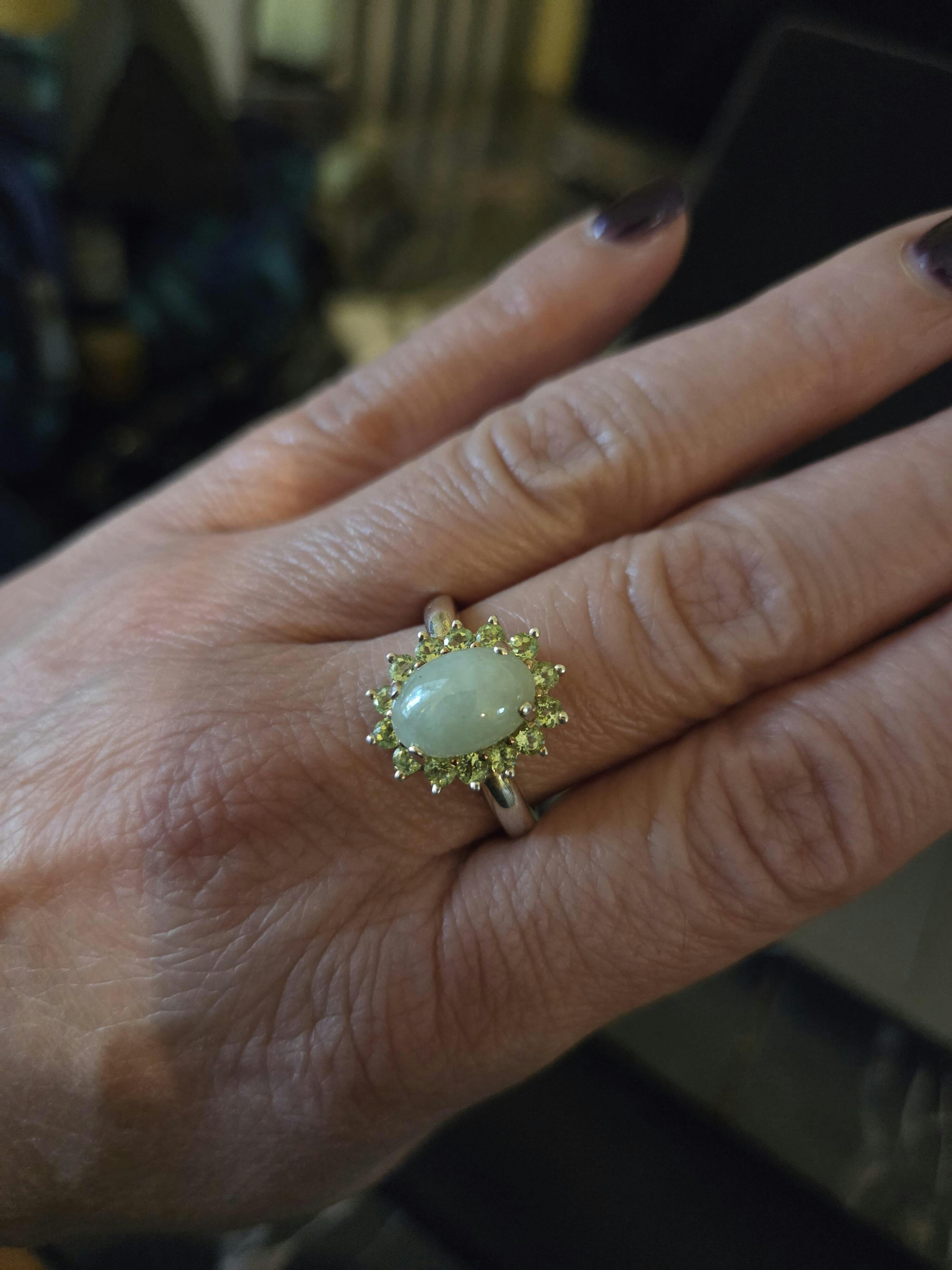 Vintage Earth Mined Genuine Ice Jade with Peridot Halo Sterling Silver Statement Ring