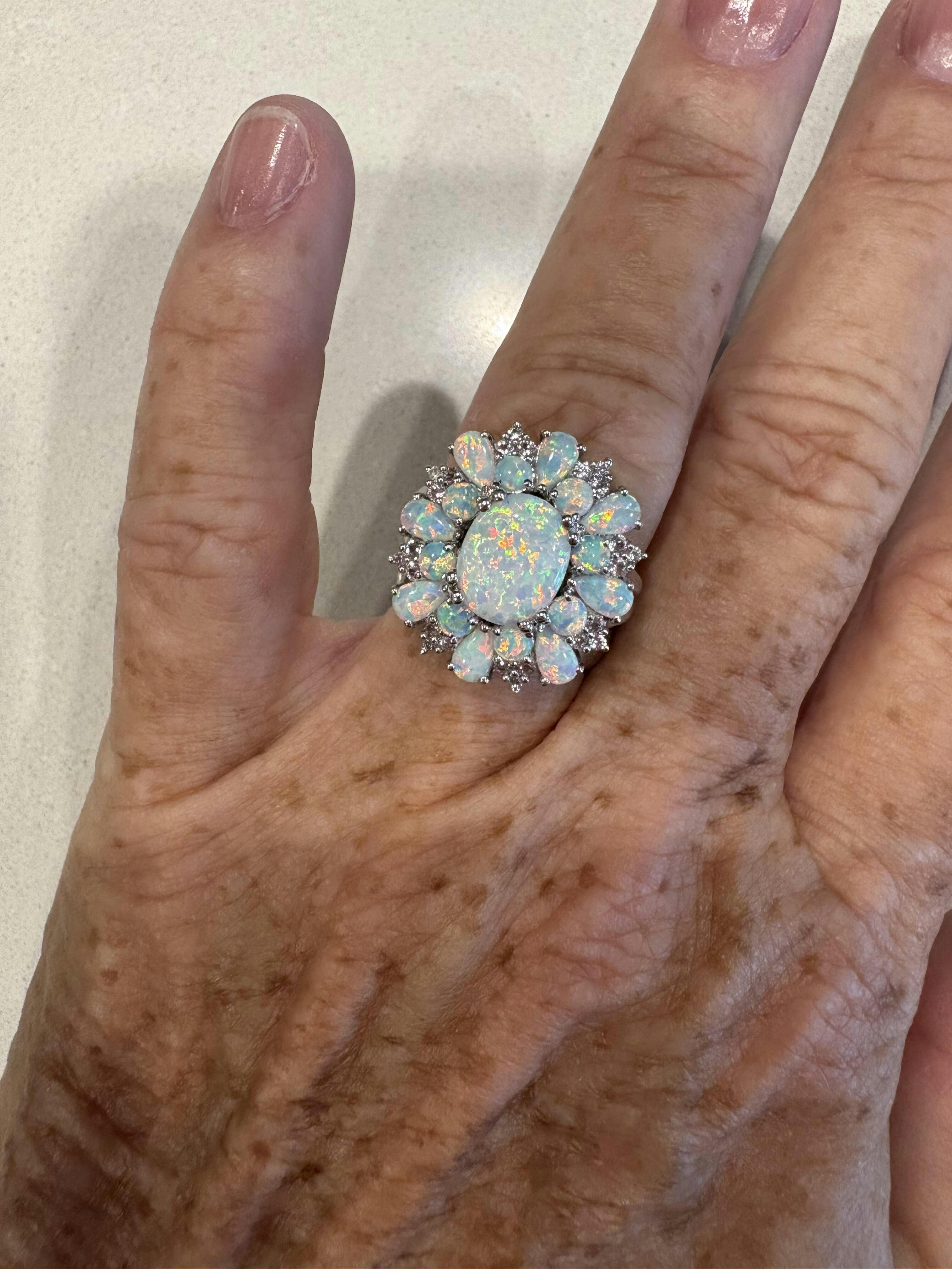 Vintage Dazzling Starburst Genuine Opal and White Topaz Sterling Silver Cocktail Cluster Statement Ring