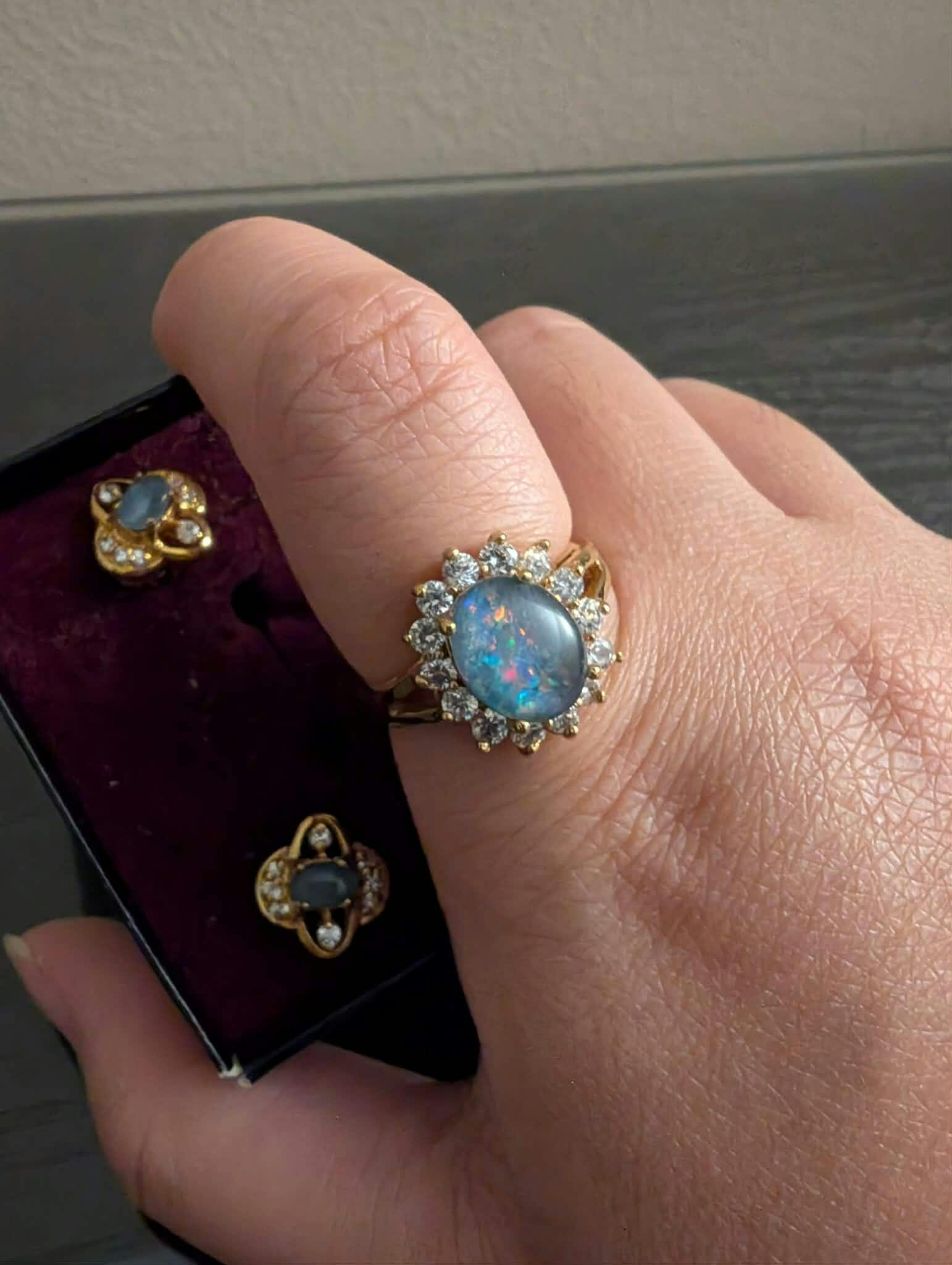Vintage Lindenwold Cabochon Cut Split Shank Simulated Opal and Simulated Diamond Halo 14k HGE Gold Ring and Matching Earrings Set