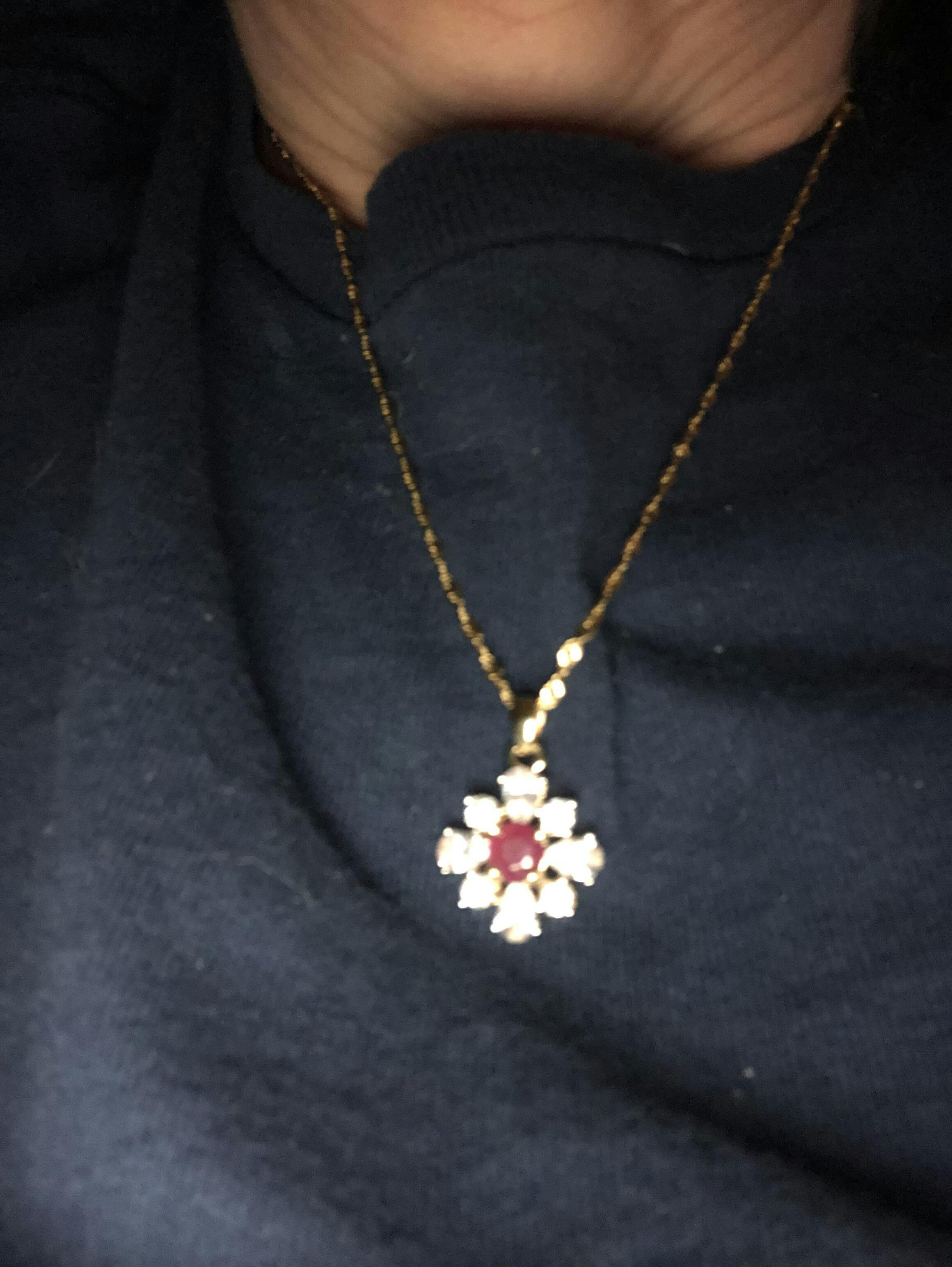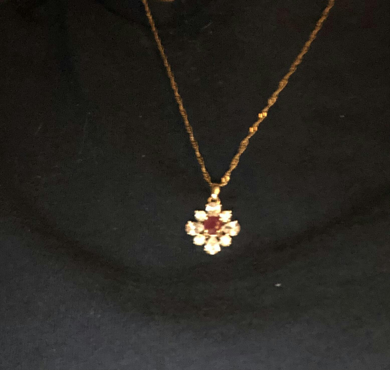 Vintage Earth Mined Genuine Ruby and Simulated Diamond Pendant and Gold Tone Chain Necklace