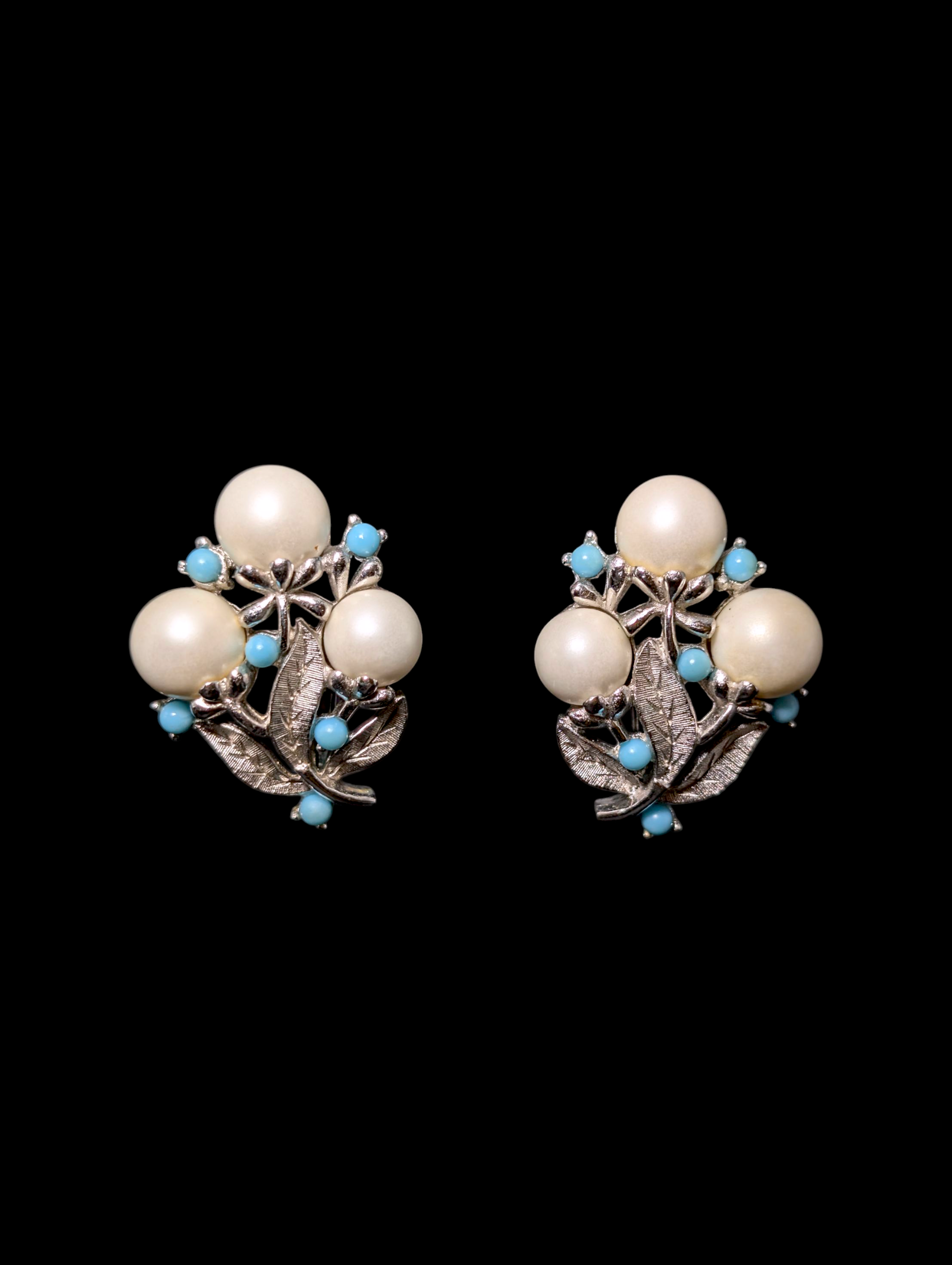 1960s Vintage Sarah Coventry Alaskan Summer Silver Toned Pearl and Turquoise Blue Beaded Wreath Brooch and Matching Earrings Set