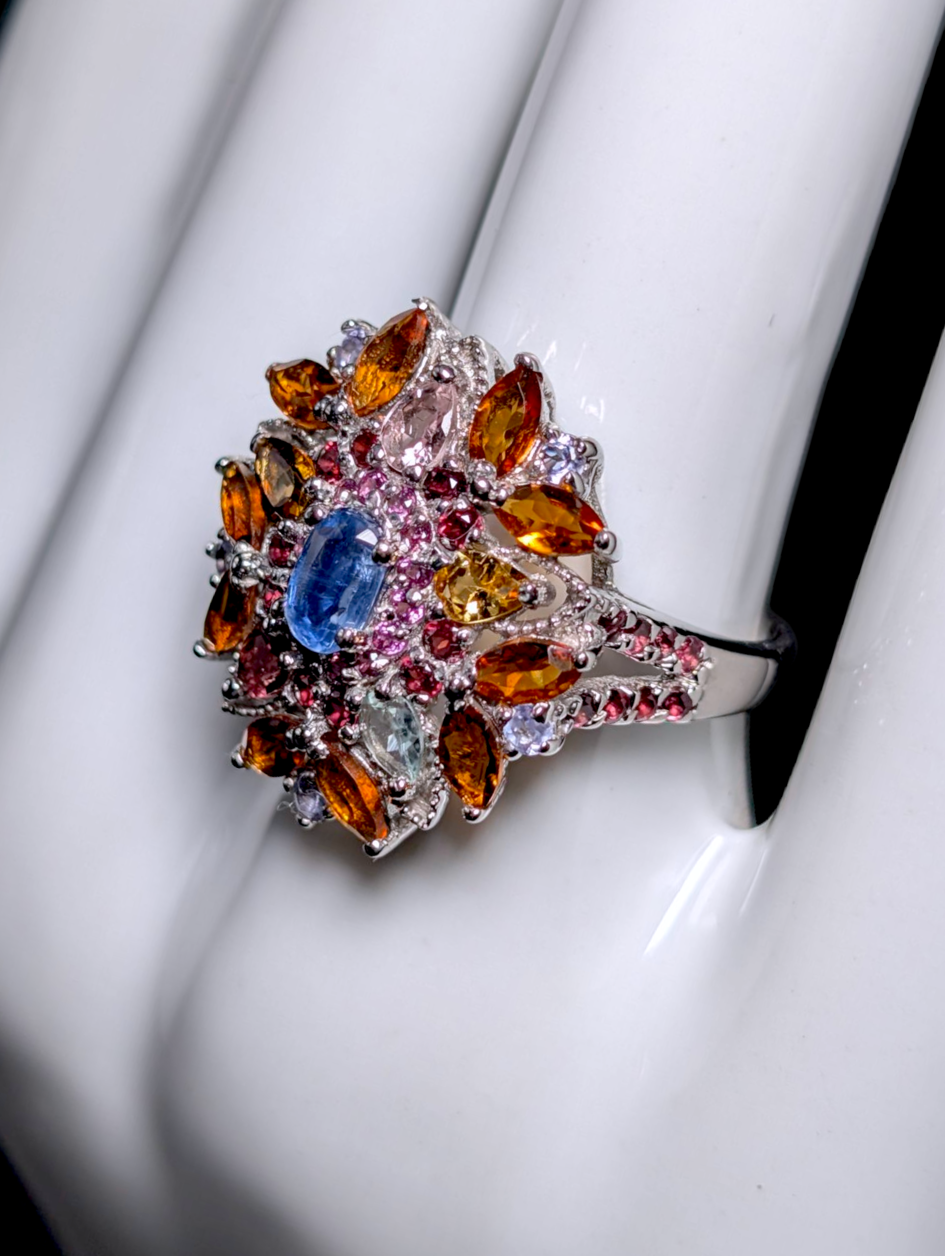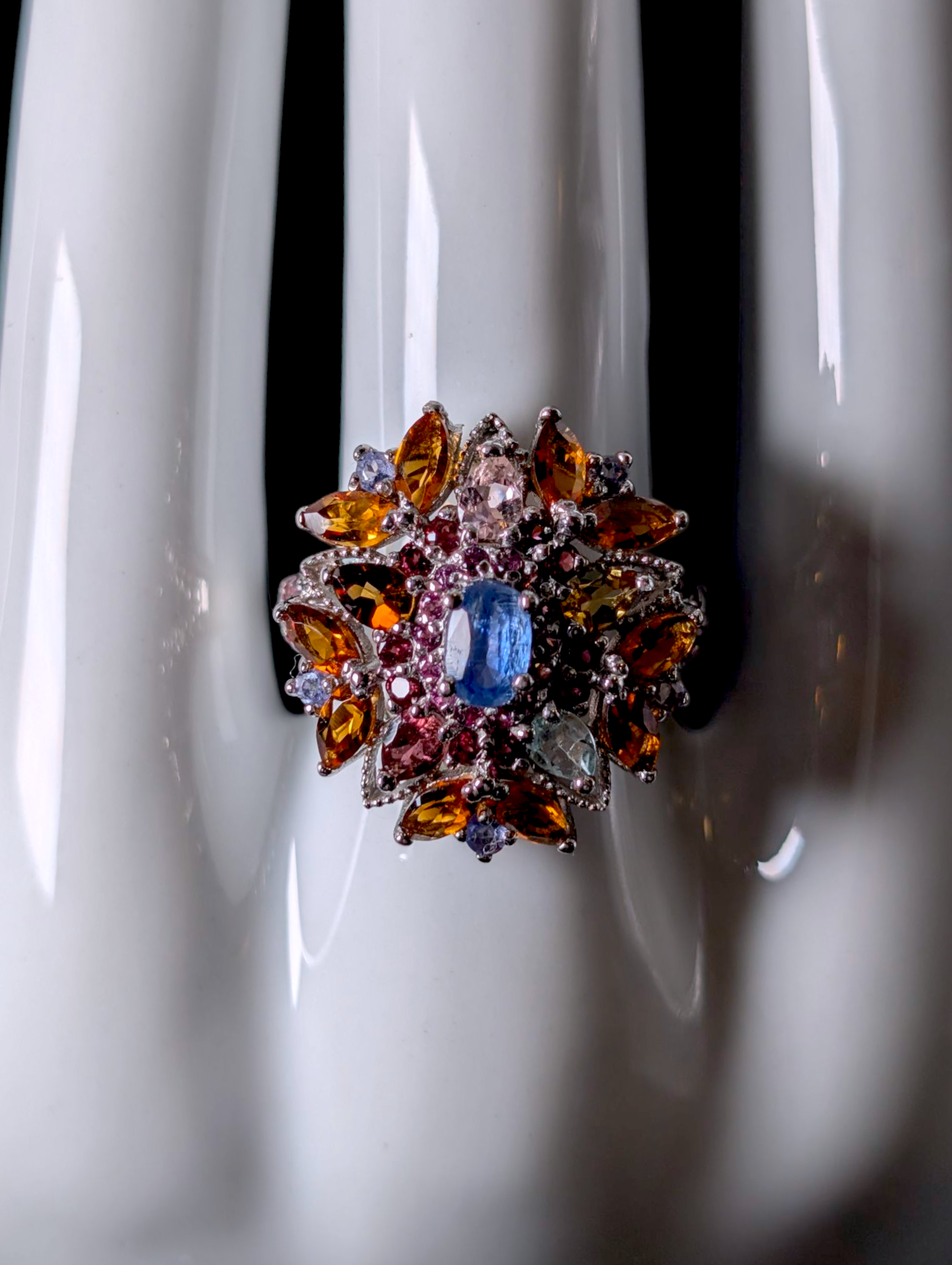 Vintage Cluster Starburst Multi-Gemstone Genuine Kyanite and Tourmaline Sterling Silver Statement Ring