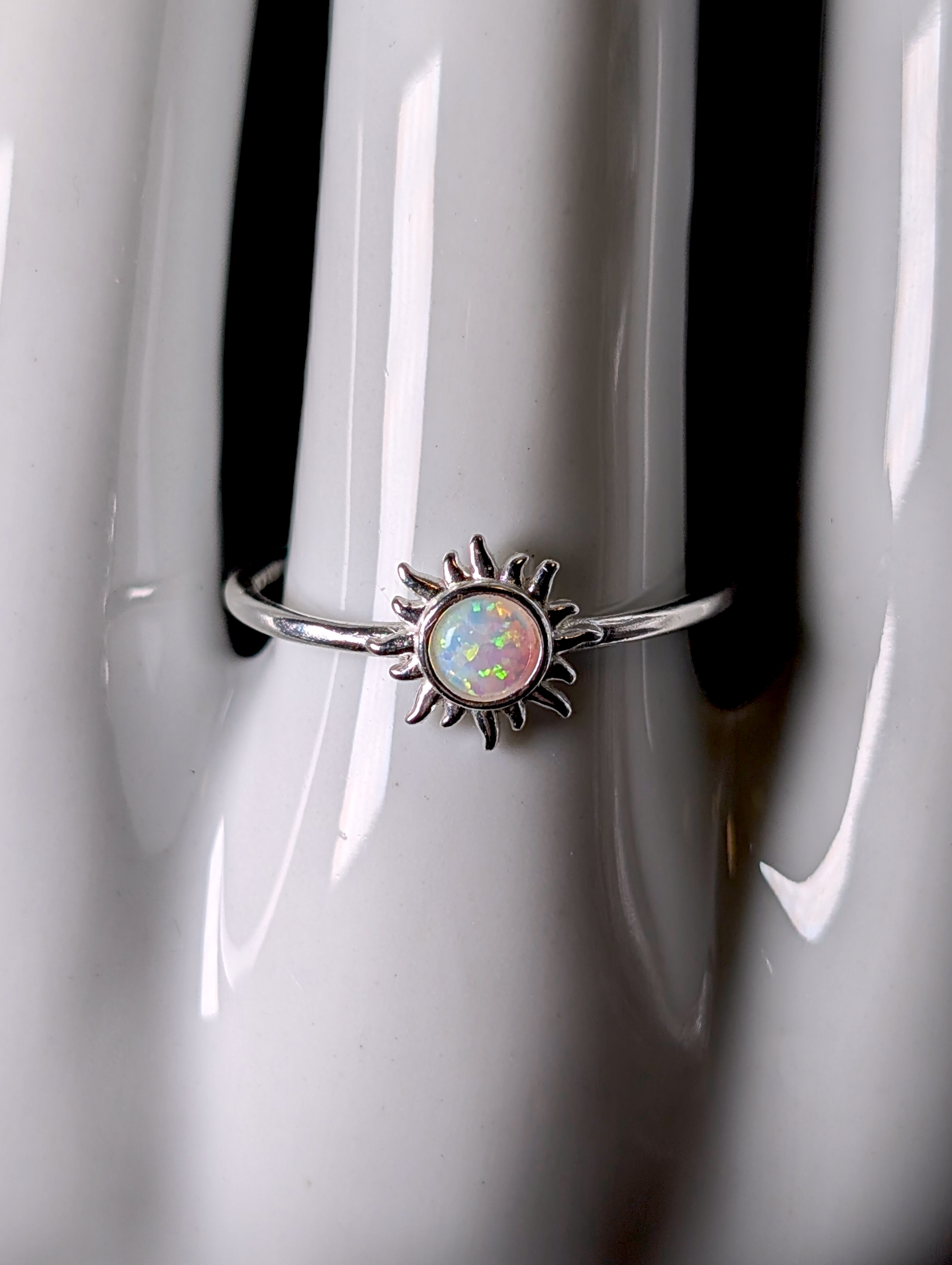 Vintage Inspired Dainty Round Cut Cabochon Genuine Opal Sunburst Stackable Sterling Silver Ring