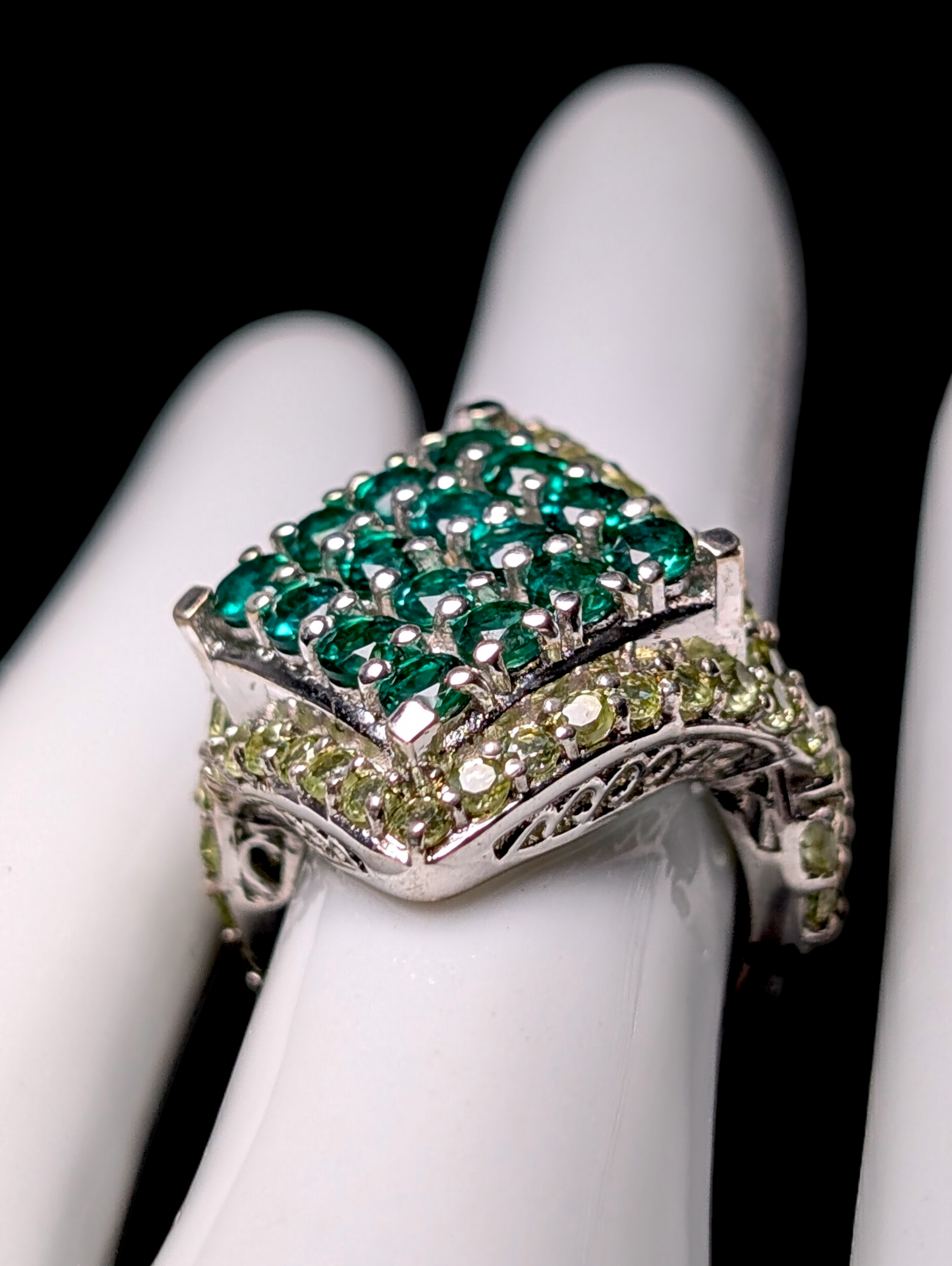 Vintage Dazzling Diamond Cluster Genuine Emerald with Peridot Halo Sterling Silver Statement Ring