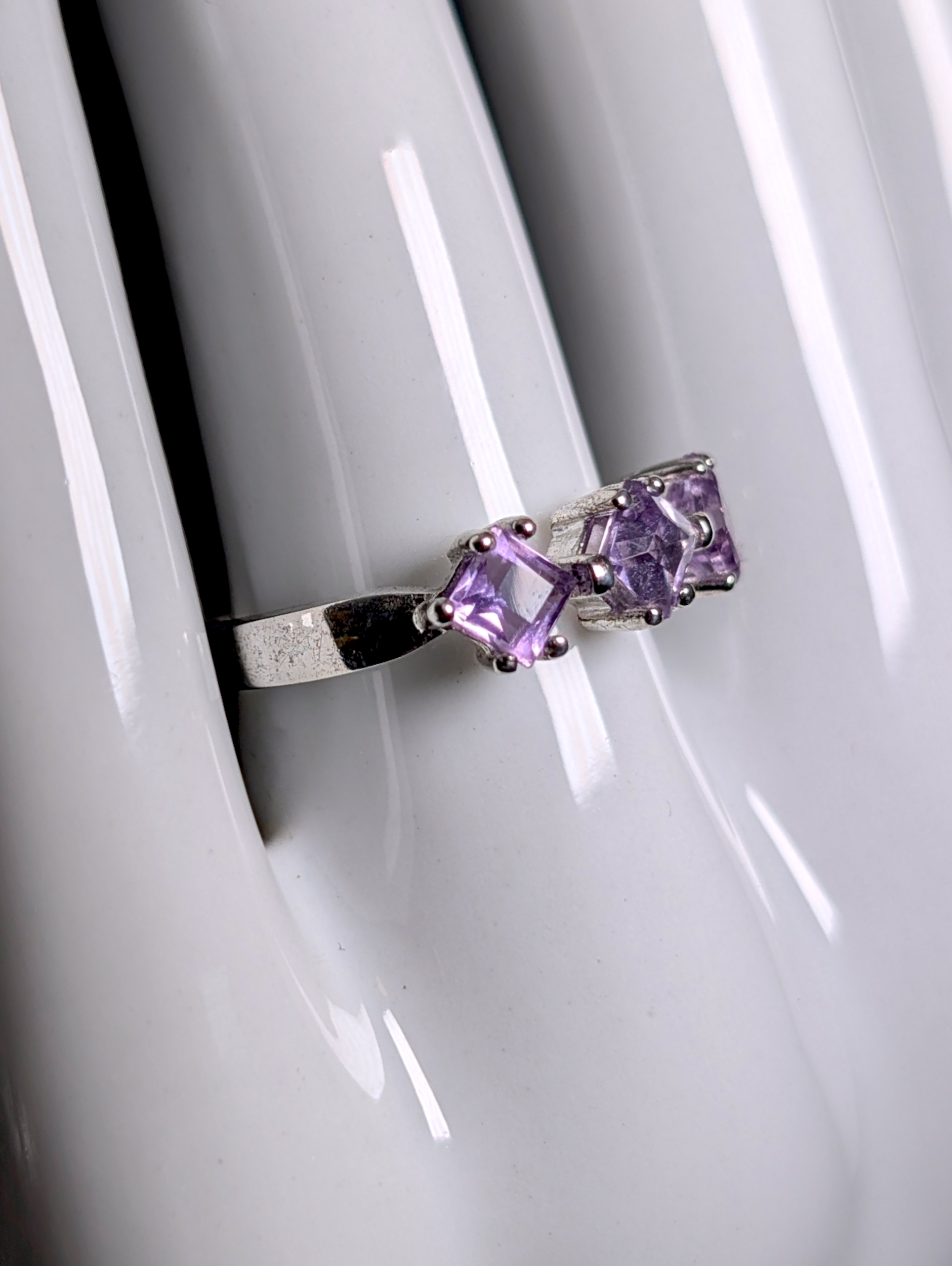 Vintage Diamond Cut 3 Stone Genuine Lavender Amethyst Sterling Silver Ring